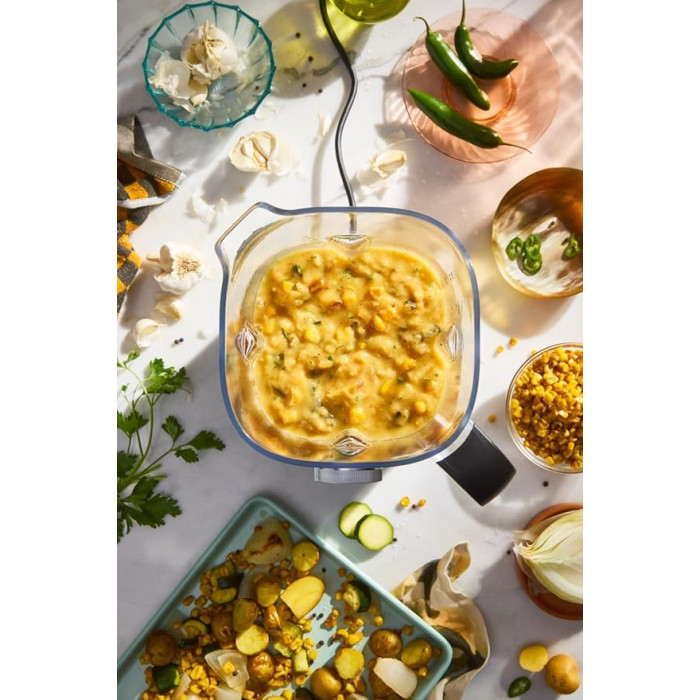 Система с 10 скоростями обеспечивает гибкость в работе: вы можете выбрать нужный режим или плавно регулировать скорость для достижения идеального результата. Это особенно удобно при приготовлении сальсы, крем-супов и смузи.