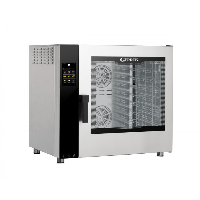 Пароконвектомат Giorik NMTE7W_R — профессиональное оборудование для ресторанов, гостиниц, пекарен и заведений HoReCa, которым требуется совмещение конвекции и пара в одной камере. Модель рассчитана на 7 уровней GN 1/1 и противни 600x400 мм и работает в диапазоне температур от +50 до +300 °C.