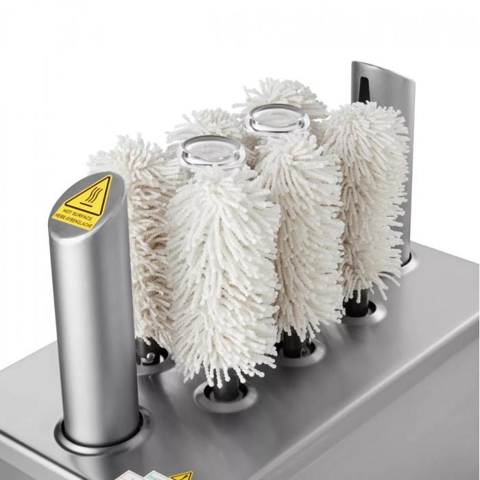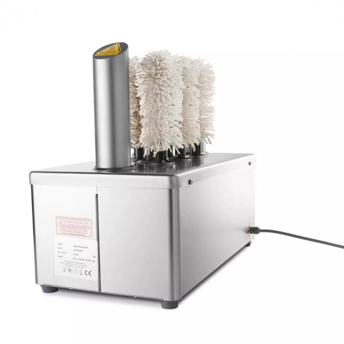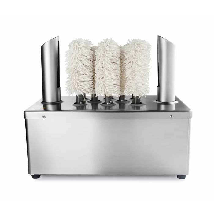 Maxima 09380000 оснащена восемью щетками: шесть внешних щеток полируют бокал снаружи, а две центральные обрабатывают внутреннюю часть. Два воздушных обдува ускоряют сушку, а щетки из натурального волокна бережно работают с бокалами и стаканами разной формы. Корпус из нержавеющей стали рассчитан на интенсивную ежедневную эксплуатацию, а съемные щетки упрощают очистку и обслуживание оборудования.