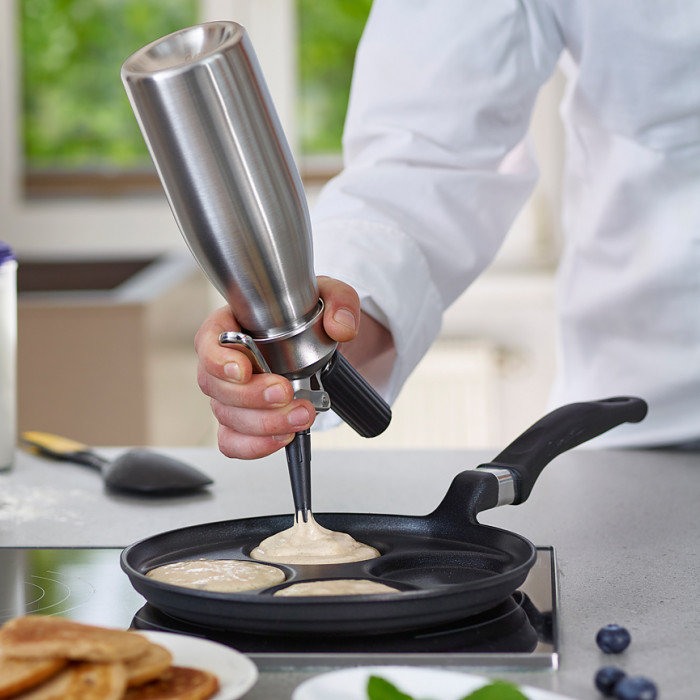 Корпус выполнен из нержавеющей стали, что обеспечивает долговечность, гигиеничность и устойчивость к интенсивной эксплуатации. Сифон позволяет работать с холодными и горячими ингредиентами, открывая широкие возможности для кулинарных экспериментов — от классических сливок до авторских соусов и espuma.